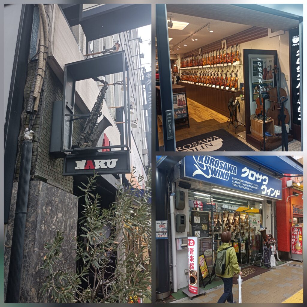 駅前大通りに出ると、サックスやバイオリン、エレキ、アコースティックのギターを取り扱うお店がずらりと🎷🎻