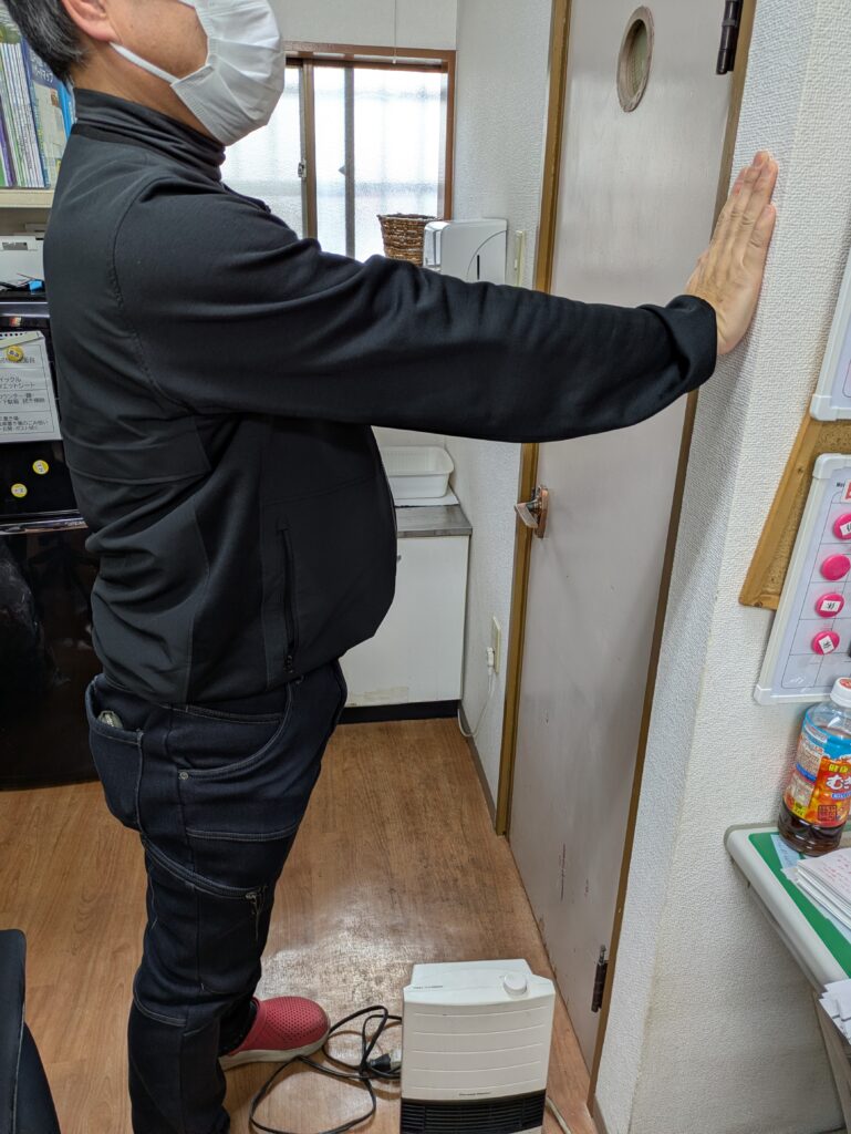 かずお「次に壁につけた手を離して肘を曲げ、10秒擦って下さい。」