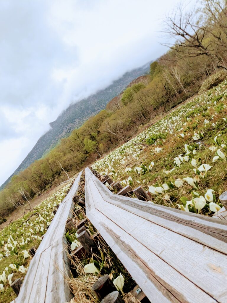 終始どんよりとした曇り空ではあったものの、逆に涼しくてとても歩きやすい気候でした。残雪もあり、湿原の色味はまだ茶色っぽいですが…この時期は水芭蕉がちょうど見頃✨